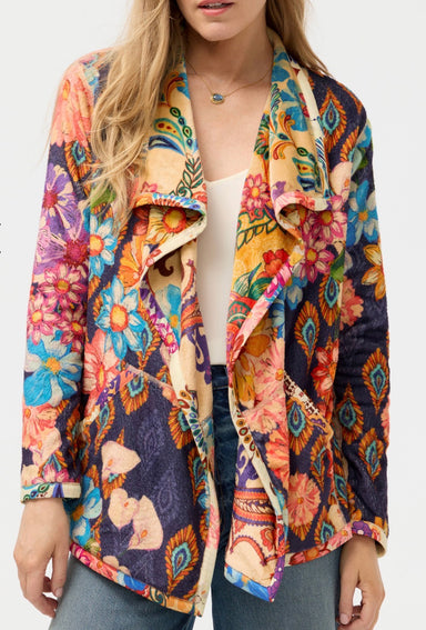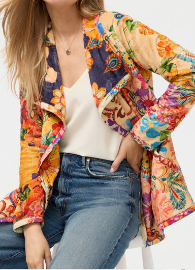 Designed with two uniquely bold patterns, the Joan Wrap Binded Sherpa Jacket is fully reversible. Washed in vibrant color and eye-catching flor...