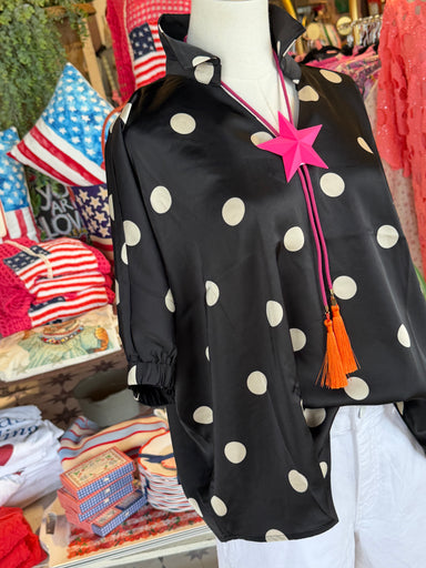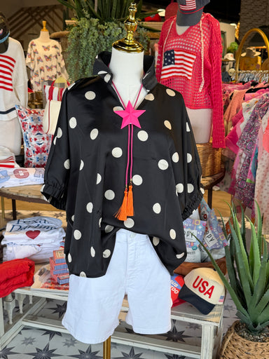 The Dot to Dot Top features a silky black and white polkadot design complemented by a collar and a V-neck dolman fit. This combination allows for e...