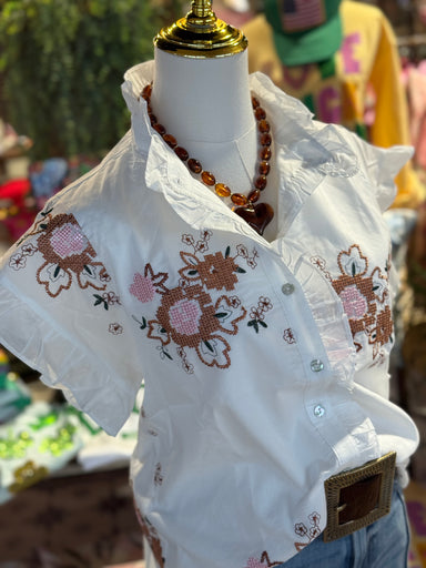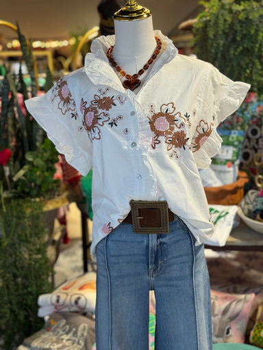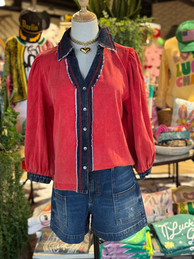 The Rita Ann Top features 3/4 sleeve design with ribbed texture and denim accents around the collar, buttons, and sleeves. Made from 100% cotton, ...