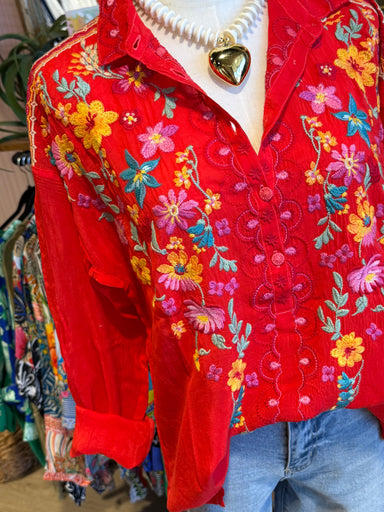 Crafted from flowing 100% silk, the Tambou Blouse is adorned with vibrant green and floral images. Featuring a split V-neckline with tassels an...