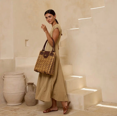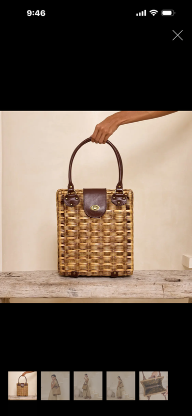 Large Rattan Handbag with dark leather trim and batik print lining. Interior compartments, twist lock closure. 11.5 x 14 × 6 inches. The beautiful ...