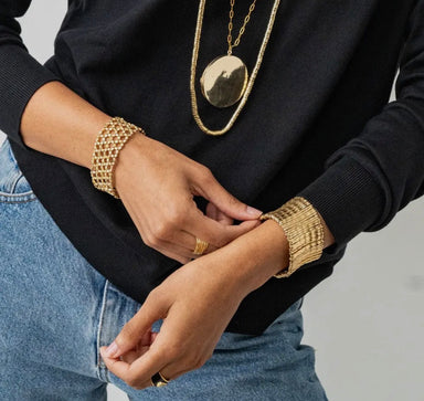 Bold Looks, Light Feel. Stacked brass bars Chunky vibe, barely-there weight Etfortless cool, all day long. -DETAILS-- Dimensions: 6.5" interio...