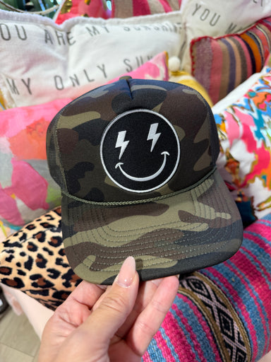 The Bolt Smiley Trucker is a camo trucker hat featuring a distinctive bolt smiley patch. Designed for adjustable comfort, this hat offers a practic...