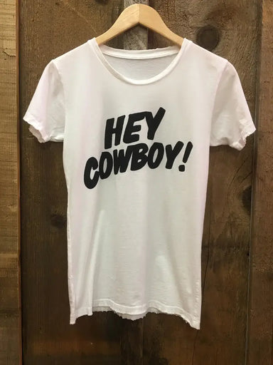 This isn't just a tee; it's a conversation starter. Our white tattered edge graphic tee features a bold "HEY COWBOY" print that brings a flirty, we...