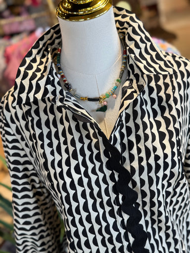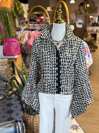 "The Janna top features a sophisticated black and cream geometric pattern, accented with a stylish black wave trimming. The elegant balloon sleeves...
