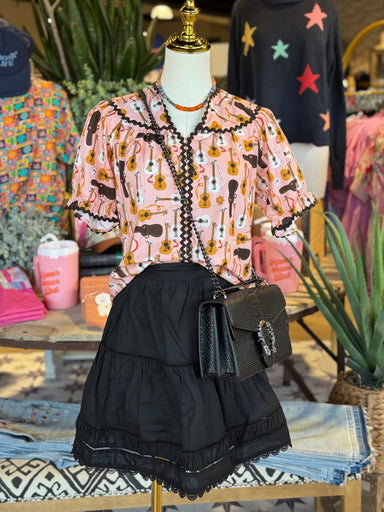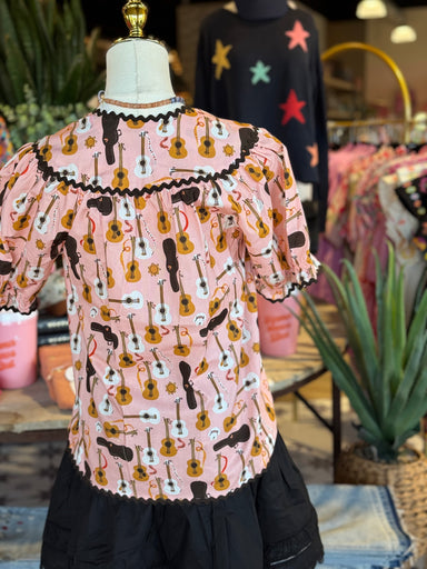 Adorable custom guitar print top. Ric Rack details. Cotton xs 38in M/L 46in