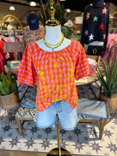 Pink stripe cotton sleeveless top with embroidery flowers. Ruffle detailing