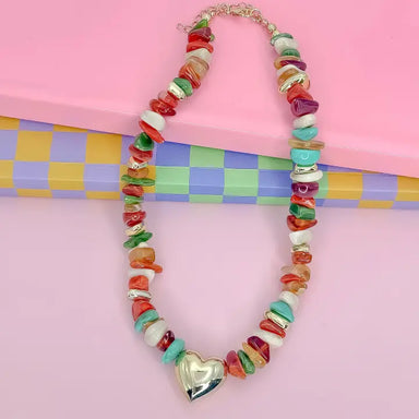 Shimmering heart shaped mother of pearl pendant on a beautifully textured chain. On the reverse side, golden raised bead detail. Can be worn long o...