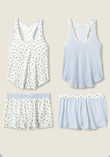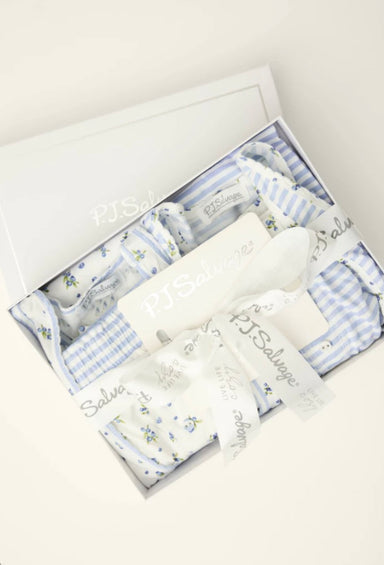 Sweet dreams, two ways. This gift box includes two soft cotton-modal pajama sets—a blue-and-white stripe and a dainty blueberry print—made to mix...