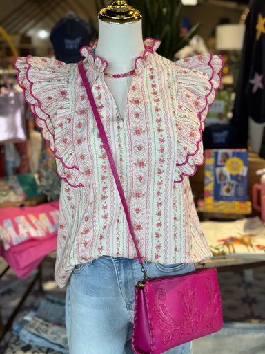 Elevate your wardrobe with the Blakely Top. Adorned with a delicate French blue floral pattern, this top features a pleated ruffle collar for a tou...