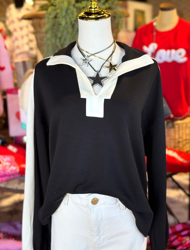 The Jena Top is crafted from a super soft rayon blend, ensuring a comfortable fit for extended wear. Its black and cream color scheme features a di...