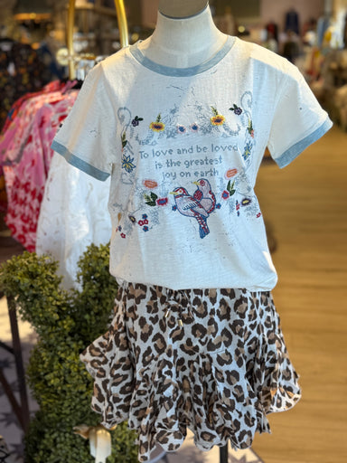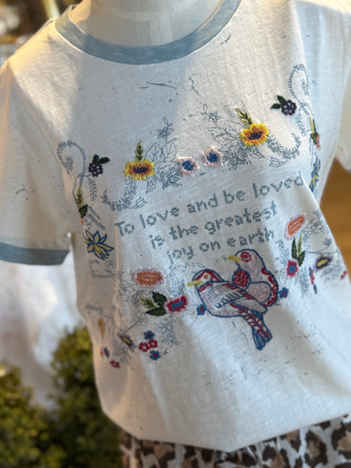 On Sale Layla Jane Tee $89.00 | / Off white tee with blue trim and embroidery detailing. Slightly roomy.