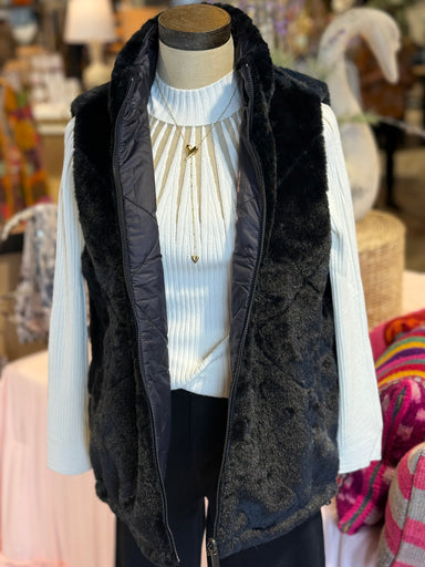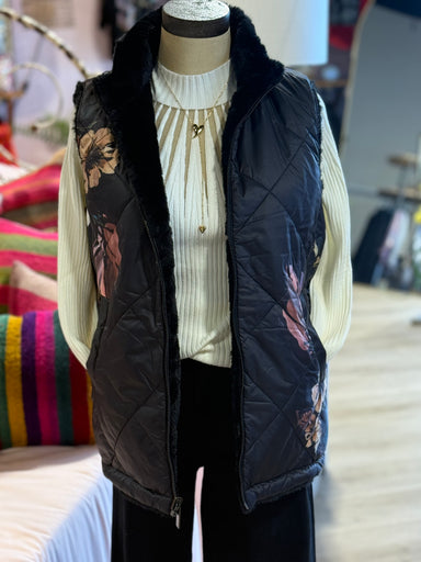 Discover the stylish versatility of this reversible quilted vest. One side has a trendy floral design, while the other boasts soft faux fur in clas...