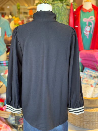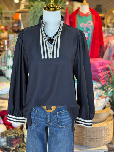 The Libby Ann Top boasts a sleek black texture and is accented with black and cream detailing on the collar and sleeves. With a convenient half zip...