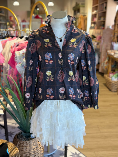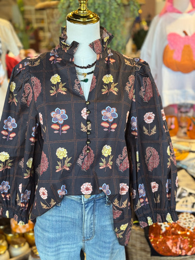 The Jeanette Top is the perfect transitional piece for any wardrobe. This black floral top features gold buttons and a delicate ruffle detail aroun...