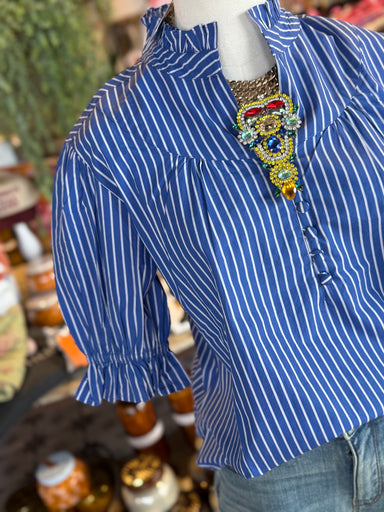 "The Lauren Stripe Top features a classic blue and white stripe design in high-quality cotton material. The short sleeves are adorned with charming...