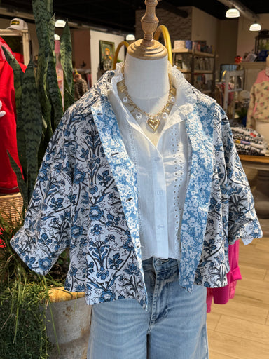 Toile Set The Toile Set offers versatility with its floral blue and white swing jacket and wide-leg barrel pants, both crafted from 100% cotton. Th...