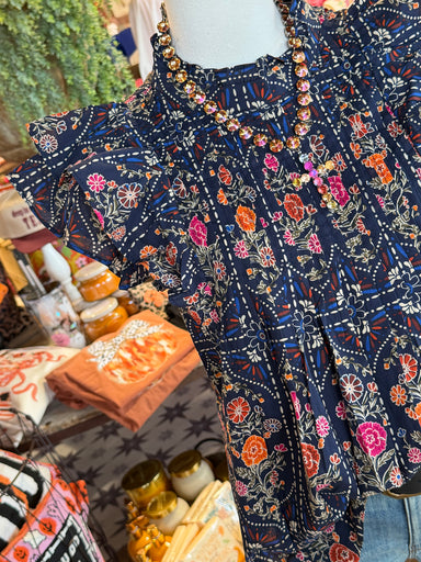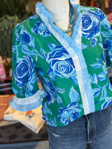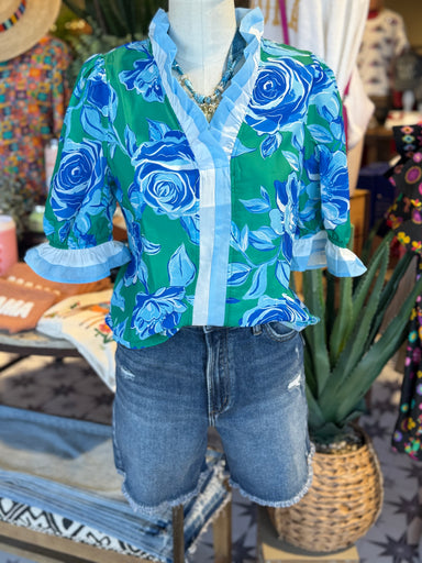 Piercing blue and green floral top with ruffle details. 3rd reorders. Please allow 7-14 day delivery