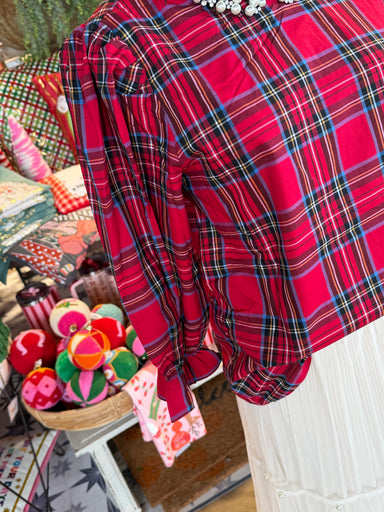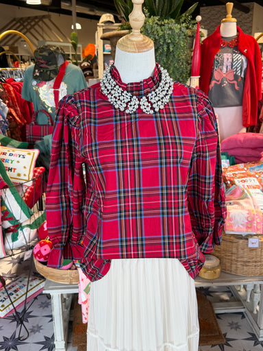Add a festive touch to your holiday wardrobe with this red plaid long sleeve top, designed with a darling tie bow in the back and a ruffled neckl...