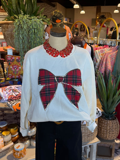 Upgrade your cozy wardrobe with our Plaid Bow Sweatshirt. Made from a soft cotton blend, this cream sweatshirt boasts a stylish plaid bow adorned w...