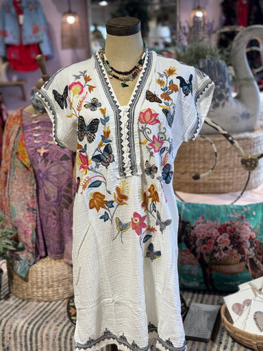 Off white cotton dress with lots of intricate embroidery of butterflies and flowers. So easy to slip on and stay cool, calm and collected.