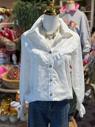 This ivory blouse features an intricate eyelet fabric design, perfect for adding a feminine touch to any outfit. It's detailed with a ruffle accent...