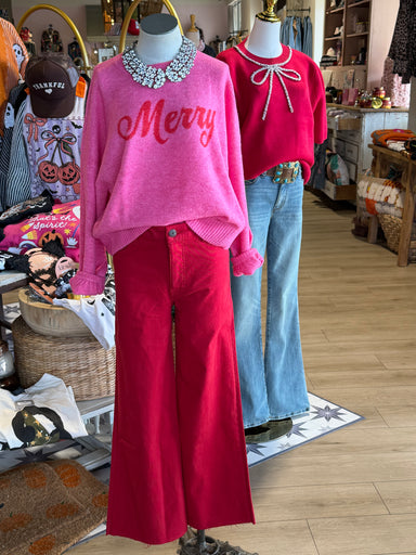 "Merry" Sweater is your go-to look for instant holiday cheer. Made from a cozy, soft knit, this cheery pink pullover features festive red script th...