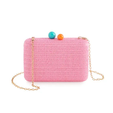 Meet your favorite clutch, the Lana This versatile bag features a trendy tweed texture in a chic pink and green color pattern with a pink push lock...