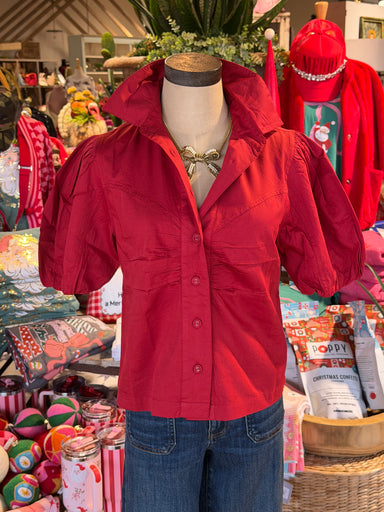 The Jamie Top in American Beauty is a modern take on the classic button-up, featuring soft ruching at the front and subtle puff sleeves for a flatt...