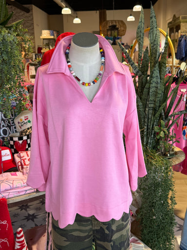 Scallop Edge Detail Solid Top 3/4 sleeves v neck top with scallop edge detail, collared neckline. 50% RAYON 45% POLYESTER 5% SPANDEX Circumferen...