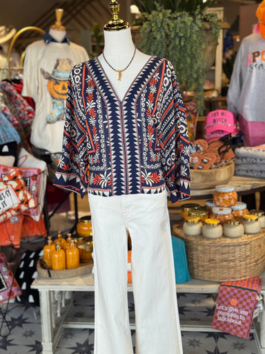 The mandolin top in vintage daisy blends, laid-back ease with bohemian flair, making it a stand out for fall. It’s Doman sleeve. Silhouette creates...