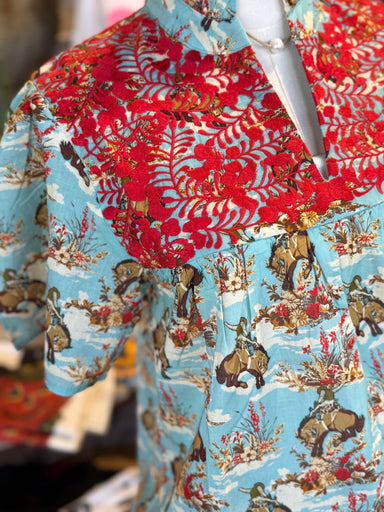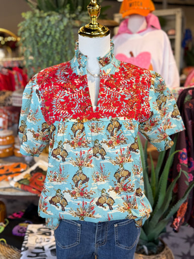 This Reece Buckin Horse top features a beautiful horse print and red embroidery, made from high-quality 100% cotton. Its durable and comfortable co...