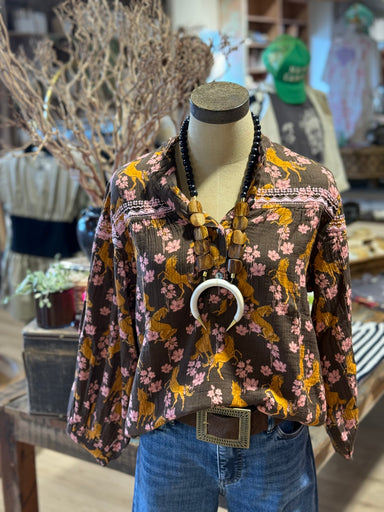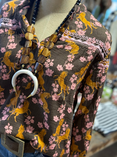 Introducing the Horsing Around Top - a stylish and comfortable choice for any equestrian lover. Featuring a brown top horse print, accented with de...