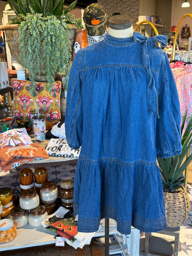 "The Dee Dee Denim Dress features a high neck design with contrasting stitch detailing. Made of wash denim, this dress offers a unique blend of sty...