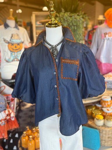 This denim button-down features elegant brown embroidery that cascades down the middle and around the collar, adding a touch of sophistication to t...