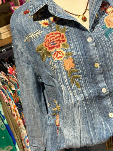 Beautiful denim button top that has front plates collar embroidery detailing. 100% tencil Circumference;XS-40 inchesS- 42 inchesM-44 inchesL- 46 i...