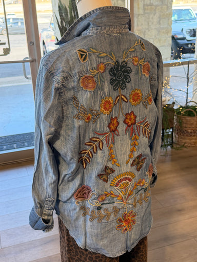 The KLara Top is a stylish denim button-down with a unique touch - delicate embroidery of butterflies and flowers adorns the back. Made with 100% t...
