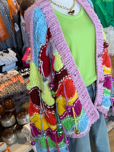 Unleash your inner disco diva with our Rainbow Color Block Disco Ball Cardigan. This oversized piece features trendy fringe details and a statement...