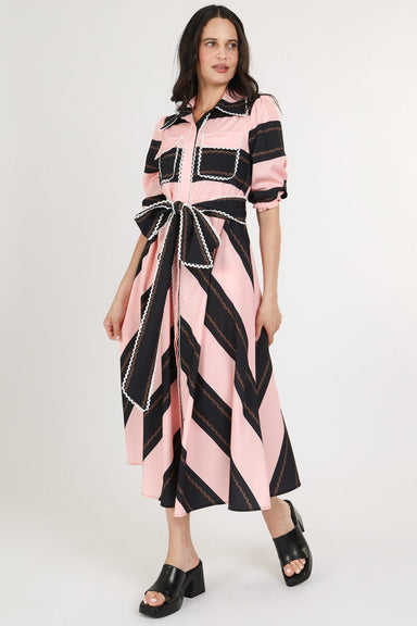 Expertly crafted with a detachable tie and scalloped lace detailing, this pink and black stripe dress exudes elegance and versatility. The perfect ...