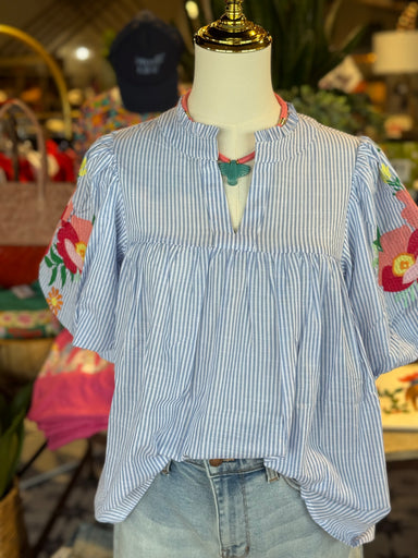 Blue and white stripe top with embroidery floral detailing S 36in M 37in L 38in