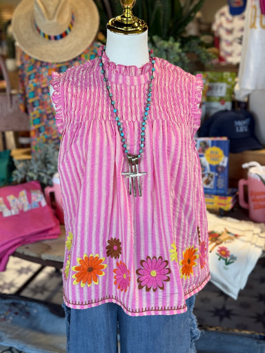 Pink stripe cotton sleeveless top with embroidery flowers. Ruffle detailing
