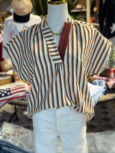 This caramel brown Brandi Stripe Top boasts a striped design and short dolman sleeves. Expertly crafted, it offers both comfort and style for a ver...