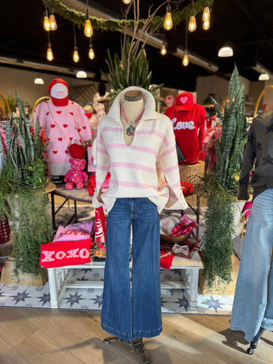 The Robyne Ann Sweater features a cream base adorned with light pink stripes, offering a visually appealing design. The overlapped collar and rippe...