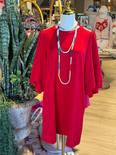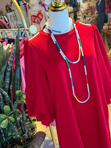 The Reba Dress features a red hue complemented by puff sleeves, offering a soft tactile experience due to its rayon blend composition. The inclusio...