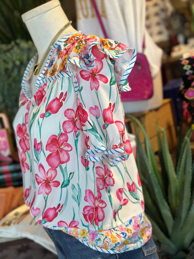 Expertly designed with a ruffle neckline and V-neck cap sleeves, the Aurora Top boasts gorgeous embroidered flowers and a playful floral pattern. T...