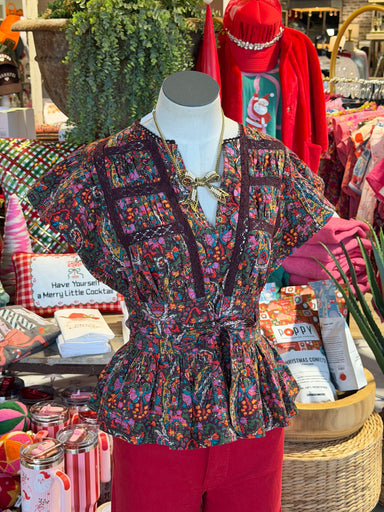 The Madelyn Top in the Harlequin Print is filled with intricate details of gathers, pintucks, and lace trim. Finished with flutter sleeves and a pe...