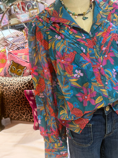 With its teal floral pattern, ruffled long sleeves, and unique little buttons, the Mindy Lou top is truly one-of-a-kind. Made from a tinsel blend, ...