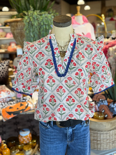 Bright, playful, and effortlessly unique, this top brings joy to your everyday style. Featuring a red, green, and blue block print with blue trim a...
