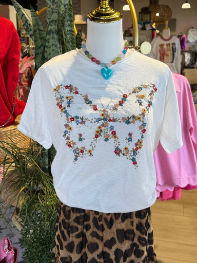 This is a white t-shirt featuring a large butterfly graphic on the front. The butterfly design is created using small, colorful floral embroidery i...