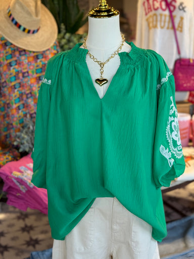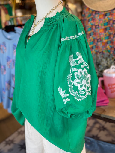 On Sale Kelly Ann Top $69.00 | / Gorgeous Kelly green blouse with white embroidery detailing. Rayon Blend true To Size